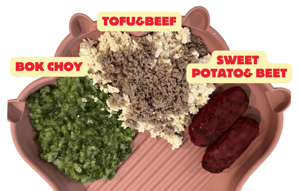 From tender steamed bok choy to a soft tofu and beef mix, and vibrant beet and sweet potato tots, this plate is inspired by my Korean kitchen. It’s a small but flavorful meal that brings together familiar ingredients and gentle textures, helping Leah explore new tastes and discover the rich world of Asian flavors.