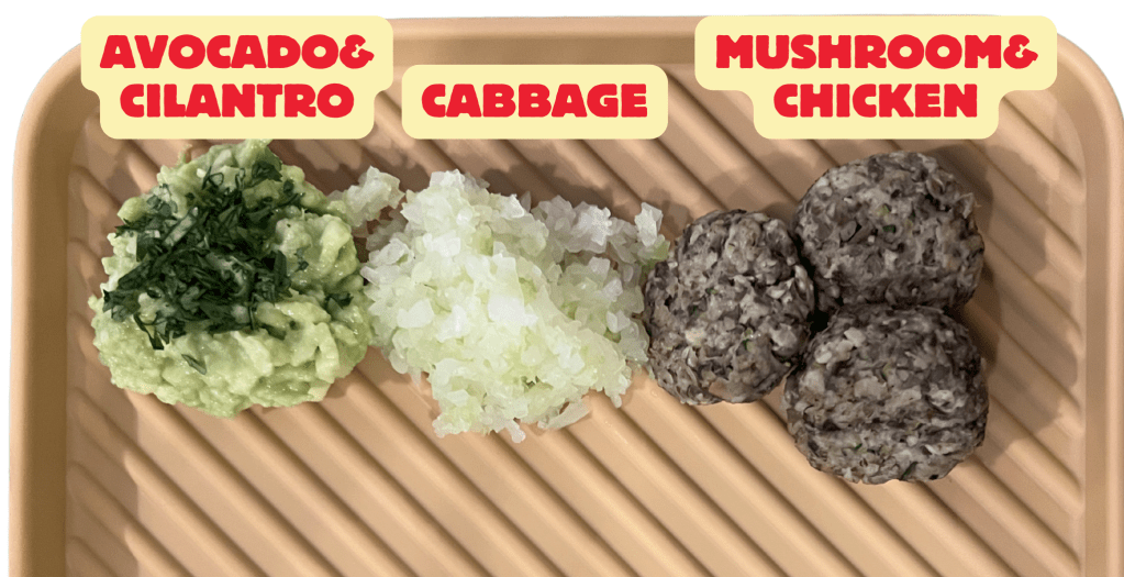 I sauteed ground chicken, added finely chopped mushrooms and steamed cauliflower for 12 minutes. Mixed in a spoonful of ground oats to help bind it all together. Shaped the mixture into small patties and baked at 350°F for about 15 minutes.