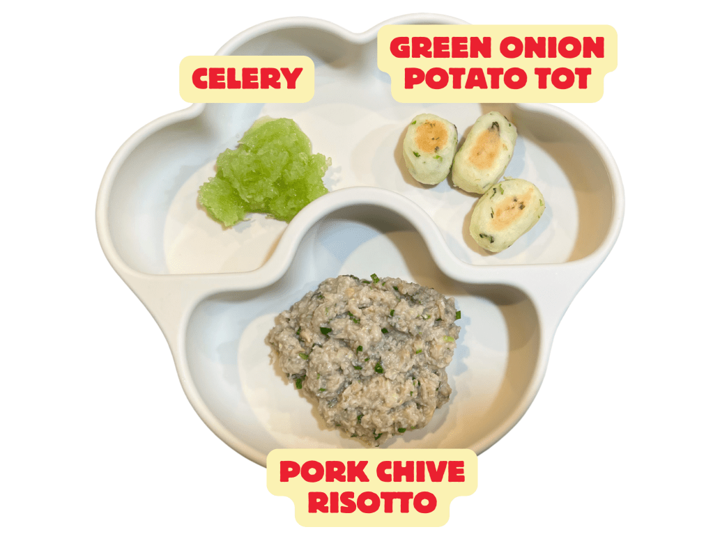 Today’s meal turned out to be a green plate. I have been adding more herbs lately, and chives go especially well with pork. It is fun to see how even small ingredients can bring new flavors to Leah’s meal.